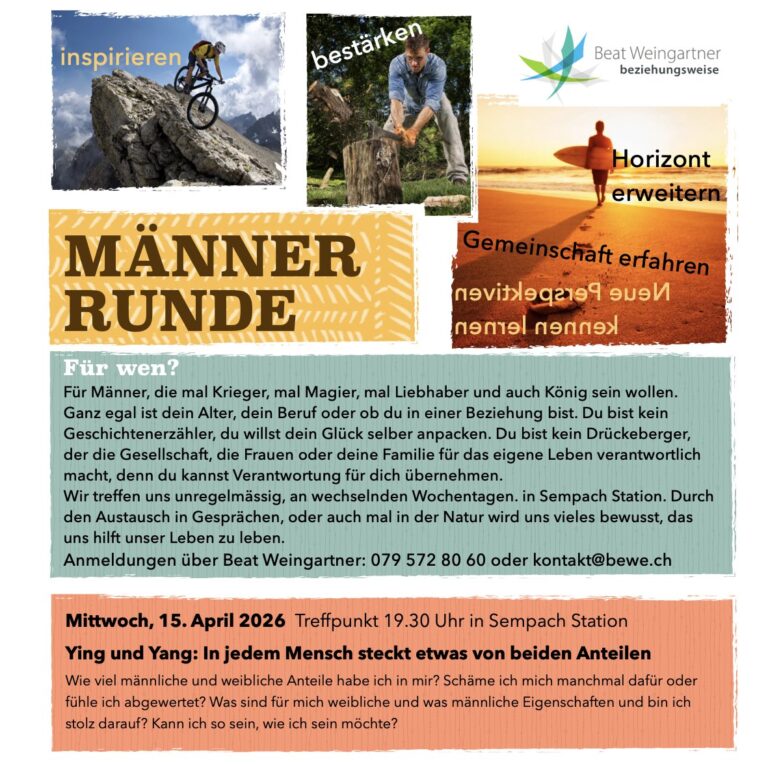 In einer Männerrunde können Themen, die uns Männer beschäftigen ganz offen, respektvoll und ehrlich diskutiert werden. Wir sind authentisch, zapfen unser Potenzial an und profitiere von anderen Männern, die doch